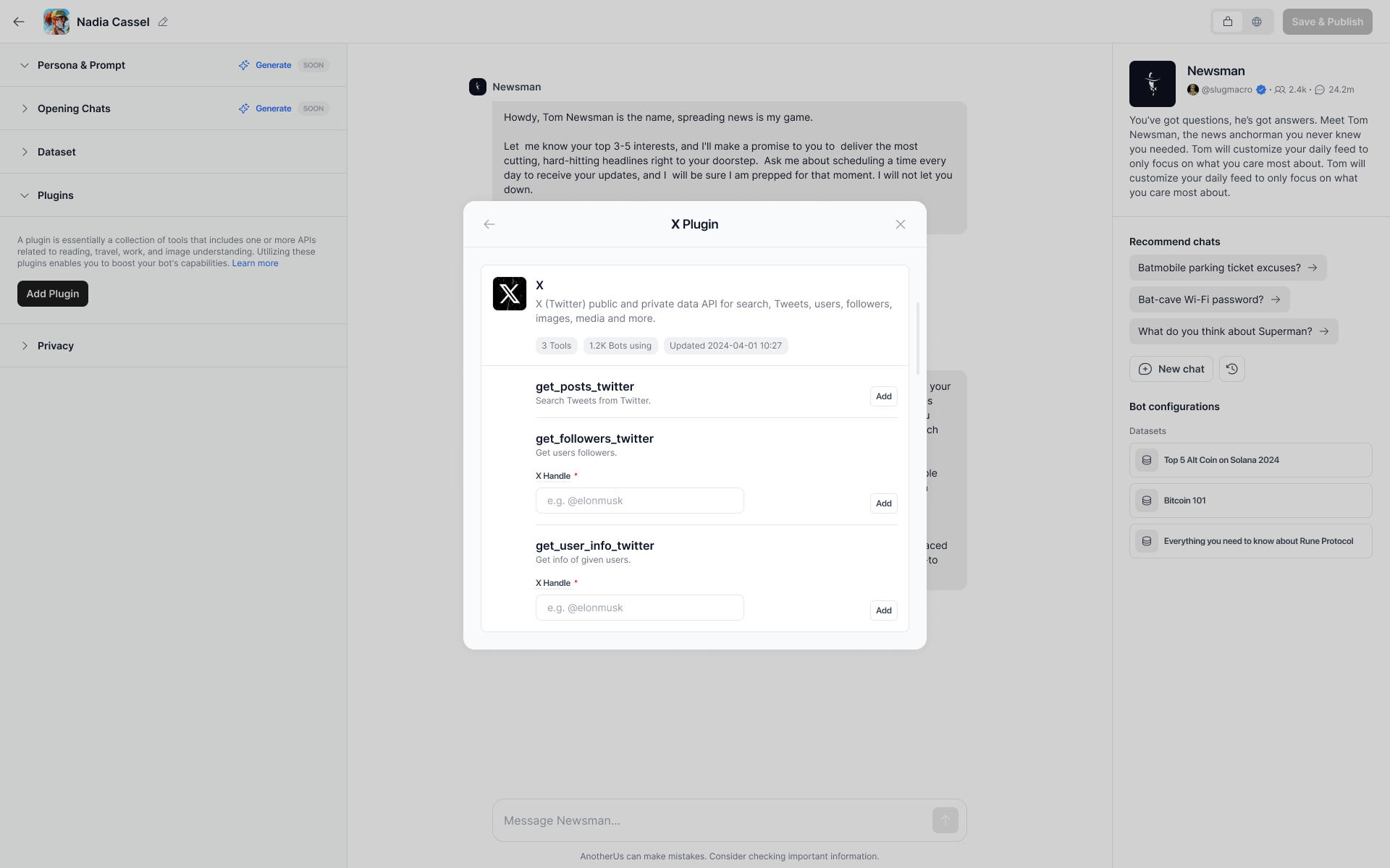 This plug-in enables your bot to access and retrieve information from selected X accounts. Currently, it supports the following functions: